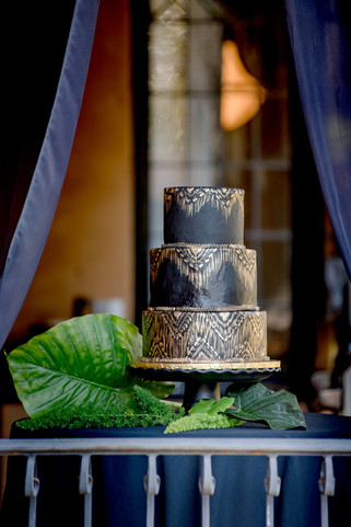 With respect to the climate, gorgeous tropical leaves and pampas grass were the ceremony arch and decor......and touches of art-deco featured with a black cake, black drapes and an abundance of cascading white orchids.